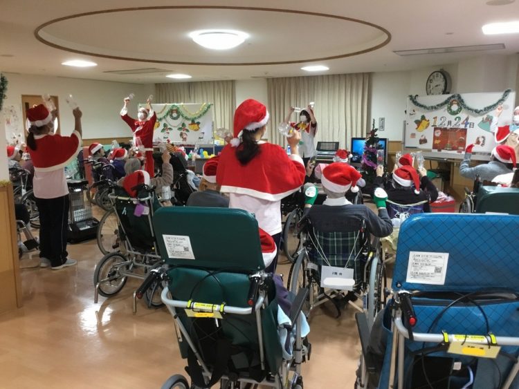 まずは、入居者の皆さんと一緒に作った手作りマラカスを使ったダンスからスタート。ジングルベルの曲に合わせて体を動かし、楽しそうな笑顔がたくさん見られました。