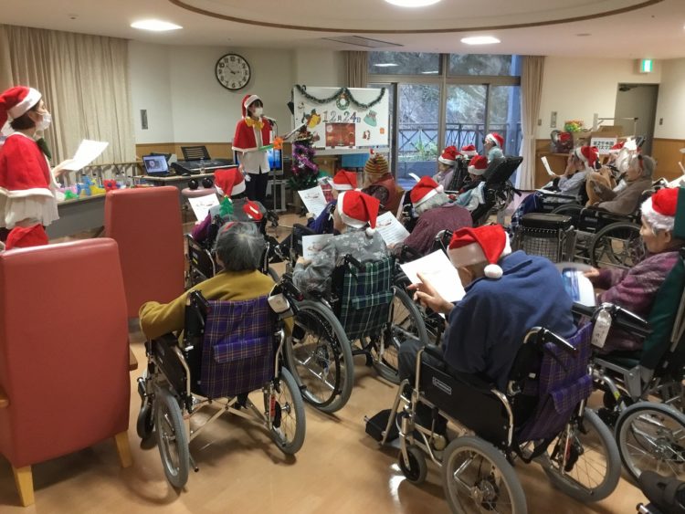 会場内はクリスマス使用に飾り付けを行い、入居者の皆さんにはサンタの帽子やカチューシャを身に着けていただきました。