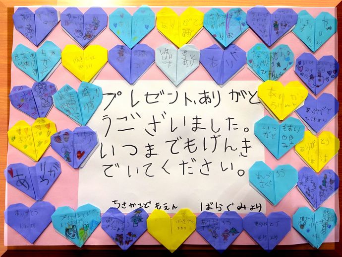 先日、千木の里と第三千木園から、園児の皆様にクリスマスプレゼントをお渡ししたところ、園児の皆様から「ありがとう」と書かれたハートのメッセージが貼られた作品が届きました。