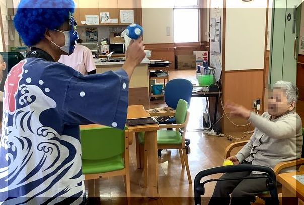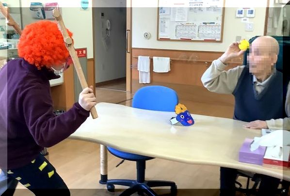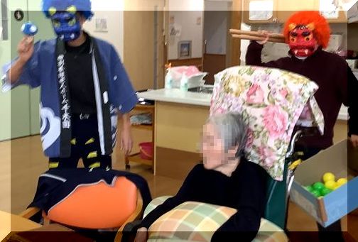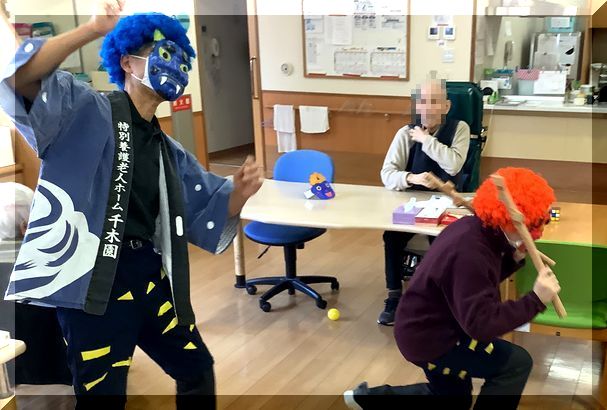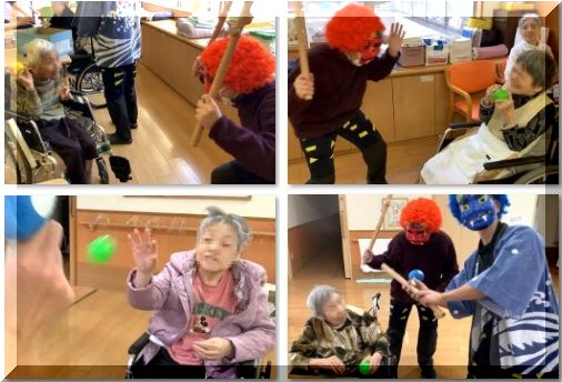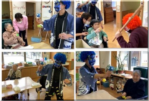 ご利用者の皆さんが鬼に目がけて豆(カラーボール)を投げると、鬼は苦しそうにして、退散してゆきます
