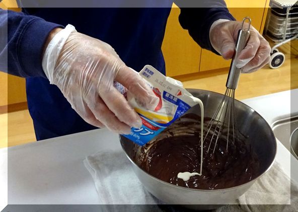 溶かしたチョコレートにホイップクリームを少しずつ加えながら、よく泡立てます。