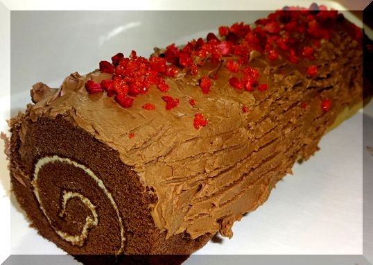 チョコレートクリームをロールケーキ表面に塗り、プラスチックフォークで線をつけ、刻んだ赤い果実をちらして完成です。