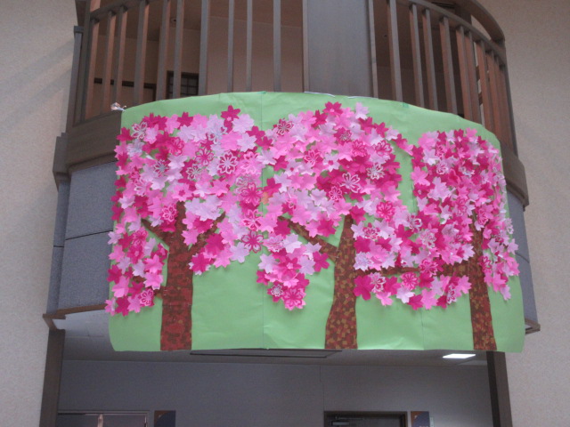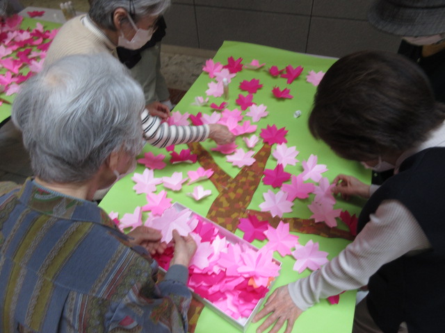 先日千木の里では、桜の開花前に折り紙で桜を作って飾り付けをしました。
